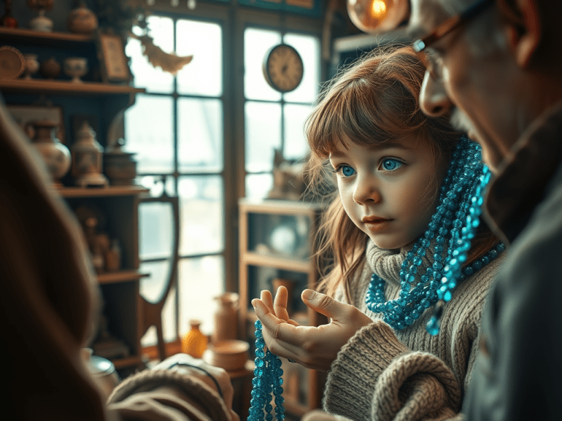 The shadowy interior of Pete Richards’ establishment was even more cluttered than his show window. Shelves were stacked with jewel caskets, dueling pistols, clocks, lamps, and the floor was heaped with andirons and mandolins and things hard to find a name for. Behind the counter stood Pete himself, a man not more than 30 but with hair already turning gray. There was a bleak air about him as he looked at the small customer who flattened her ungloved hands on the counter. “Mister,” she began, “would you please let me look at that string of blue beads in the window?” Pete parted the draperies and lifted out a necklace.
