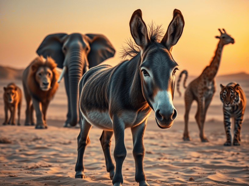 All this time a little grey beast stood listening. Finally, the other animals looked his way. There wasn’t much he could do but speak. “I am a donkey,” he began, in a voice so hoarse and low that the beasts leaned forward to hear. “I can’t run fast or go days without water. I couldn’t swim a stroke among icebergs. I’ve never climbed a tree. Nobody is afraid of me. ”