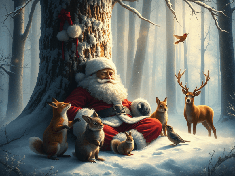 When they heard the news, the animals hopped and ran and scampered and flew to the tree.  A squirrel chattered excitedly, and Santa Claus slowly stretched, yawned, and then opened his eyes to see the faces of a dozen little creatures.
