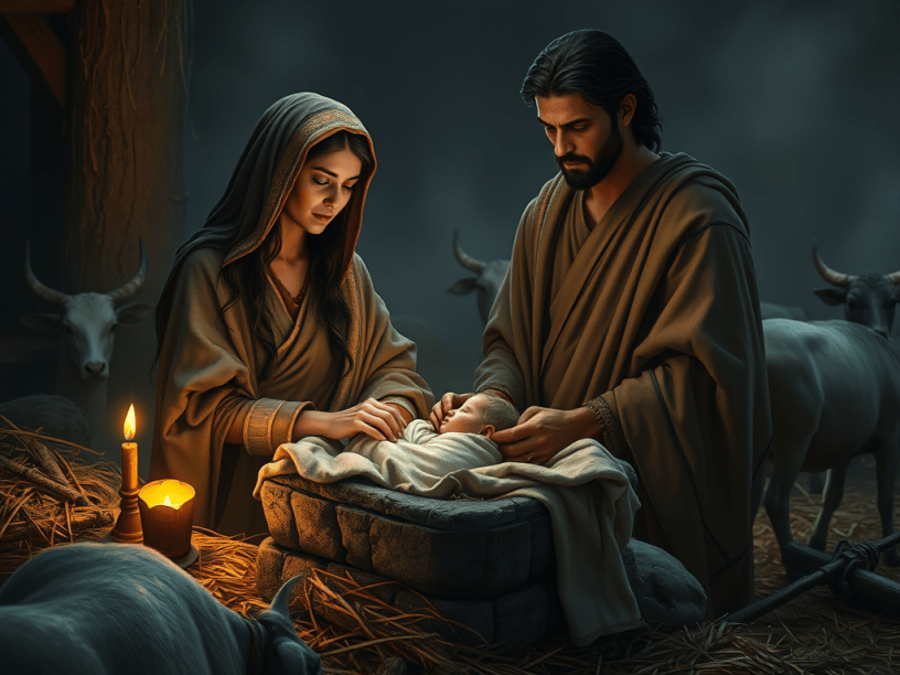 (Summary: Joseph and Mary, forced to leave their home for Bethlehem due to a census, carry a cradle Joseph crafted. Unable to bring it, Jesus is born in a stable. Shepherds, guided by angels, visit. Despite the humble surroundings, Heavenly Father provides a manger, symbolizing God’s care for all.)