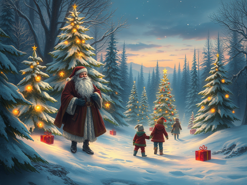 Ten minutes later, if you had been in the forest, you might have seen the children standing in dismay with tears on their faces, and exclaiming that they had never seen such a Christmas Eve before. For as they looked eagerly about them to the low-bending branches of the evergreen trees, they saw nothing hanging from them that they had seen other Christmas Eves. No presents. No one could guess whether Grandfather Christmas had forgotten them, or whether some dreadful accident had kept him away.